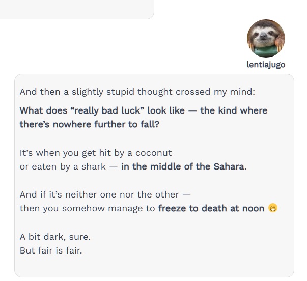 Це такий собі сюрреалістичний підручник з медіаграмотності та здорового пофігізму, загорнутий у форму ранкового флуду. Дуже влучна знахідка!